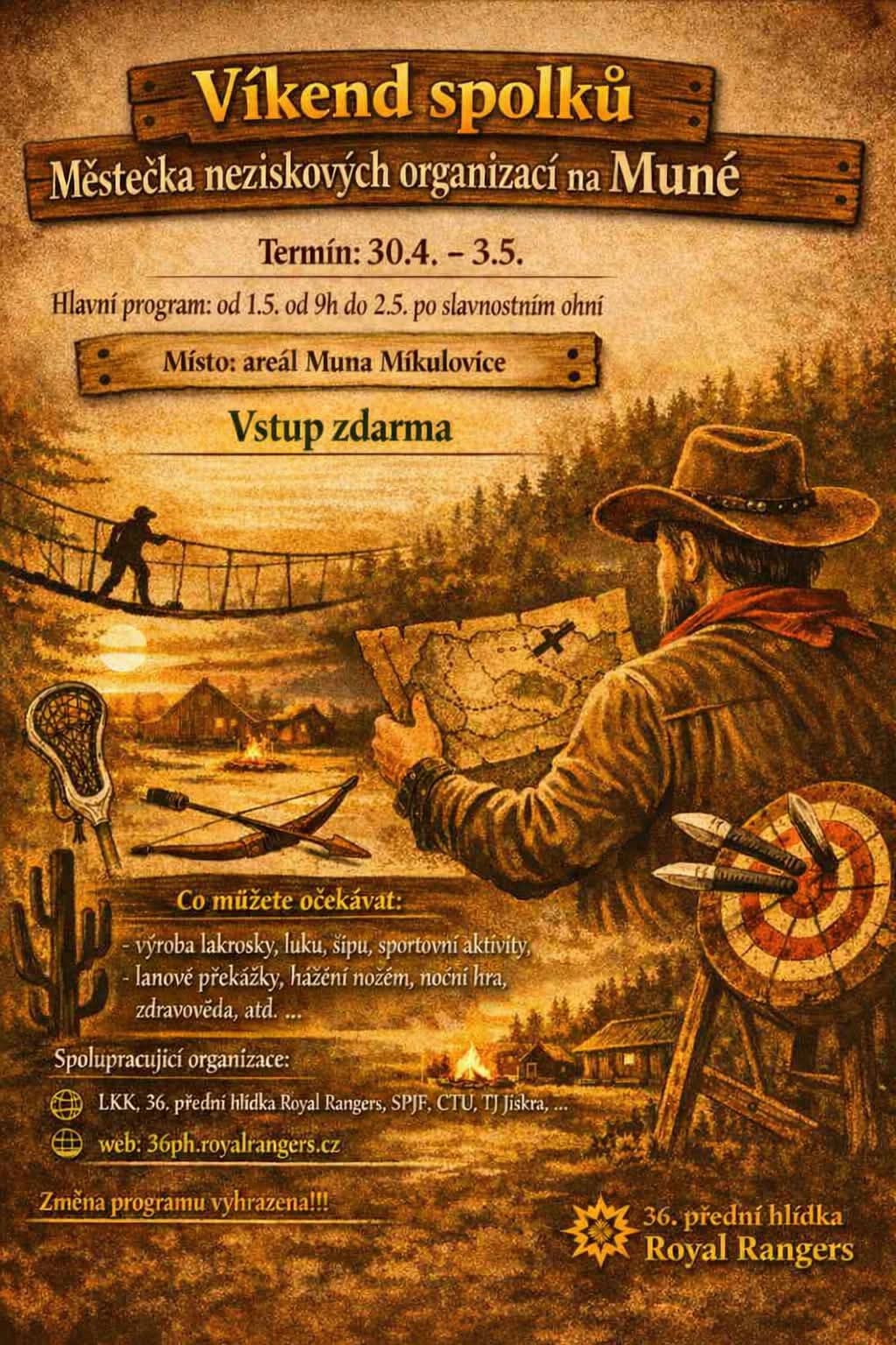 Setkání v lesích MNO na Muně - 30. 4. - 3. 5. 2026Již tradiční společná akce organizací, které mají svůj objekt v areálu Muny. Na akci zveme rodiče a kamarády.